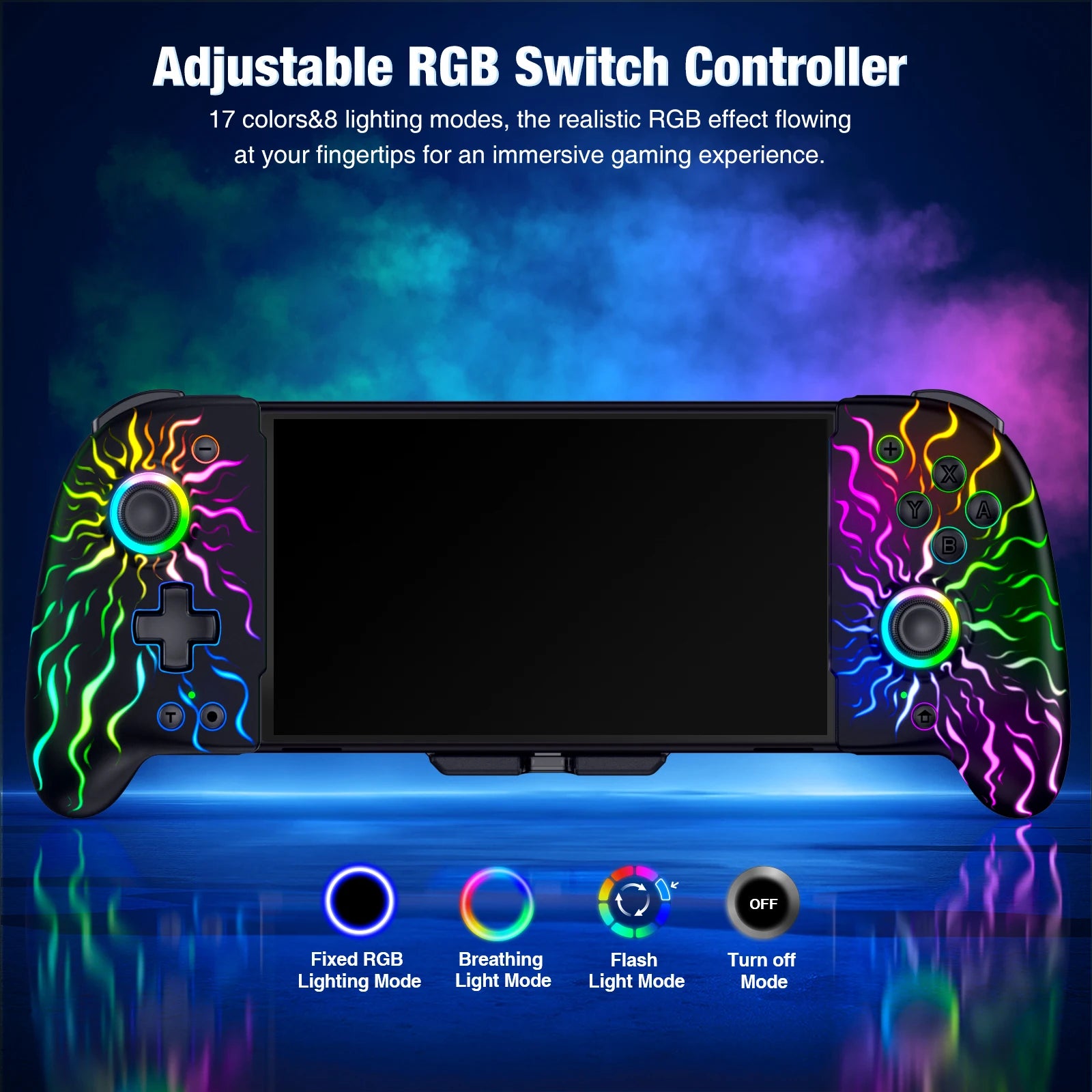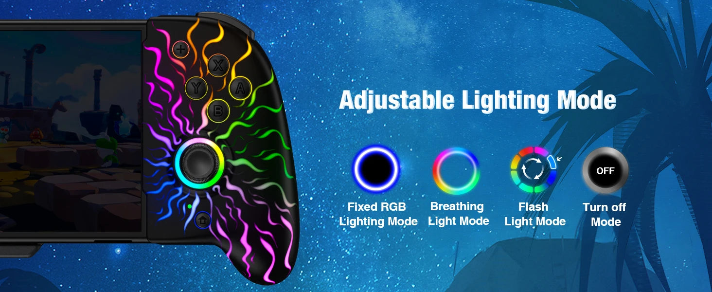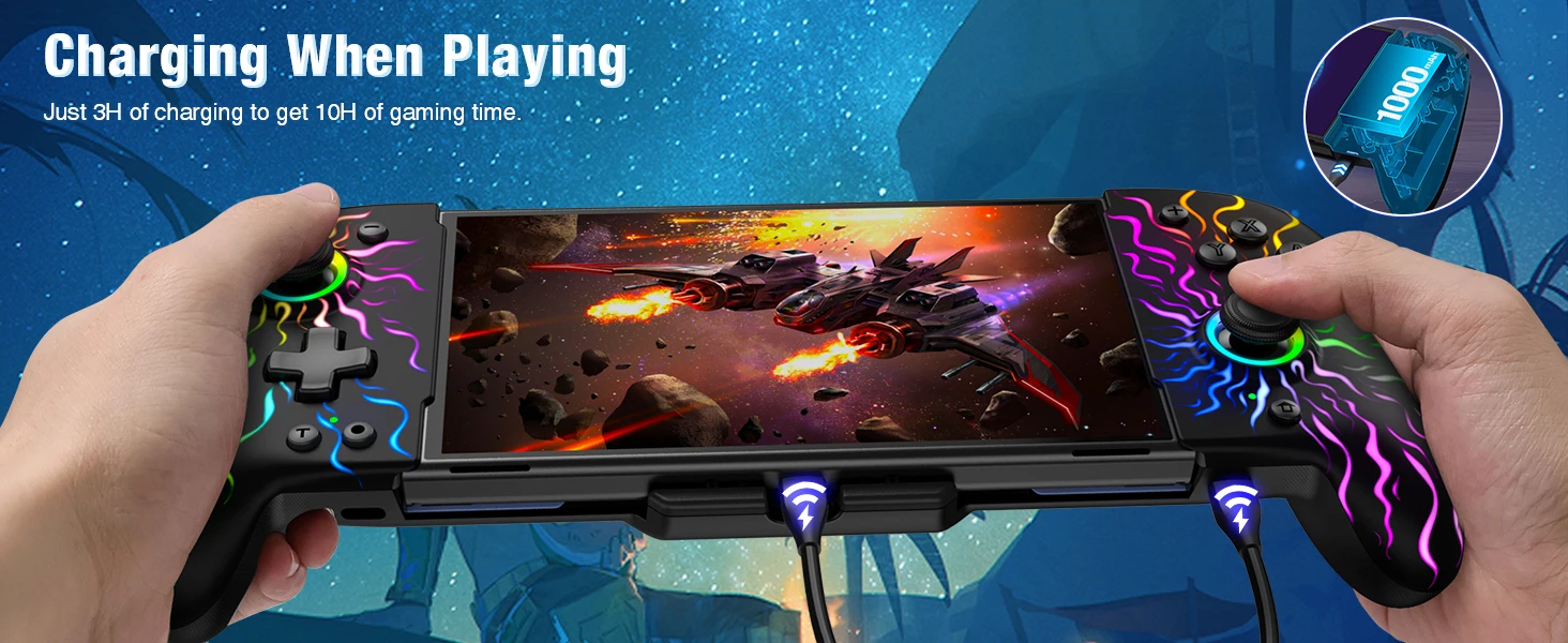 🎮17 Lighting Effects & 1000mAh Battery: This Switch controllers features 4 lighting modes:, as well as 8 lighting colors and 19 lighting effects. You can select the background lighting of the switch controller based on your personal preference. The switch pro controller includes a high-capacity 1000mAh battery, which is twice the capacity of a regular Joy-C*n. It provides up to 10 hours of gameplay in light mode.