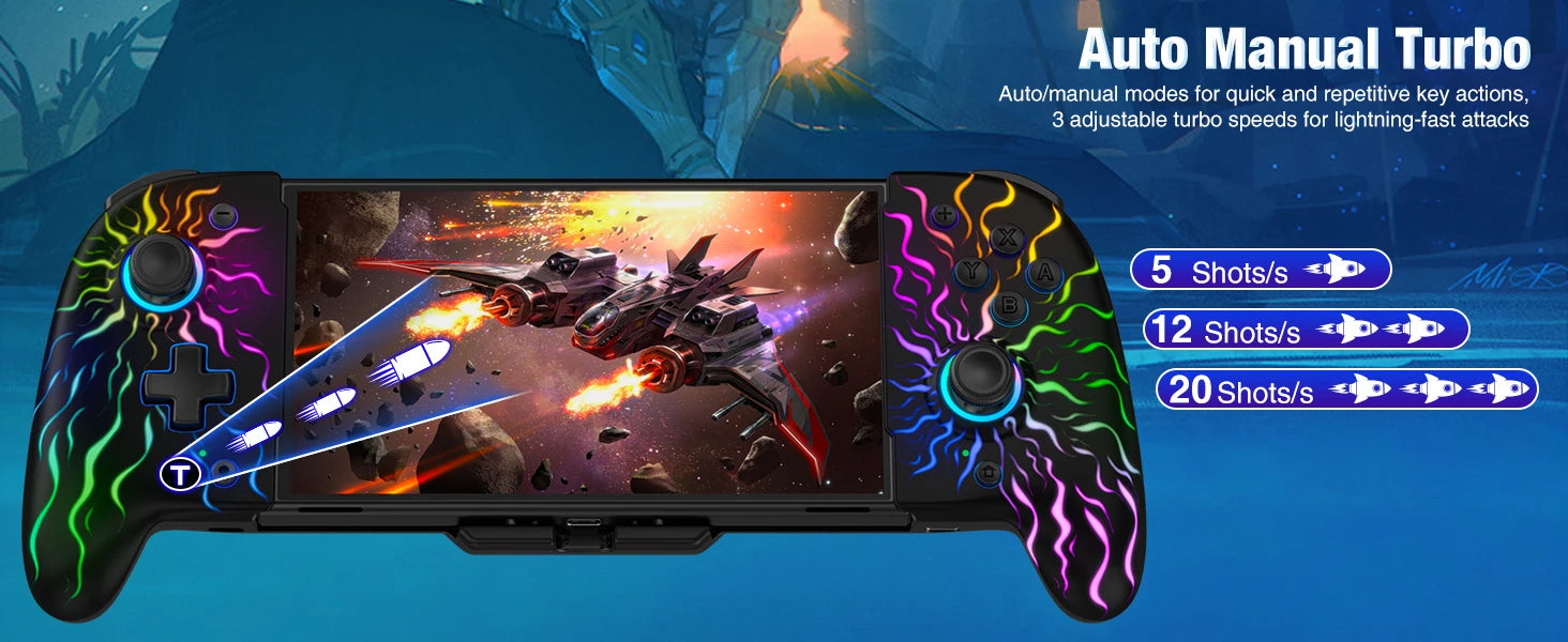 🎮3 Turbo Speeds & Auto Attack: The Switch pro controller supports auto/manual Turbo function, The Turbo function allows you to continuously output a base button without interruption. This feature is particularly useful in games that require uninterrupted clicking of a single button, such as intense gun battles or games with numerous dialog boxes. You can set Turbo to 5/12/20 shots per second depending on the needs of the game.